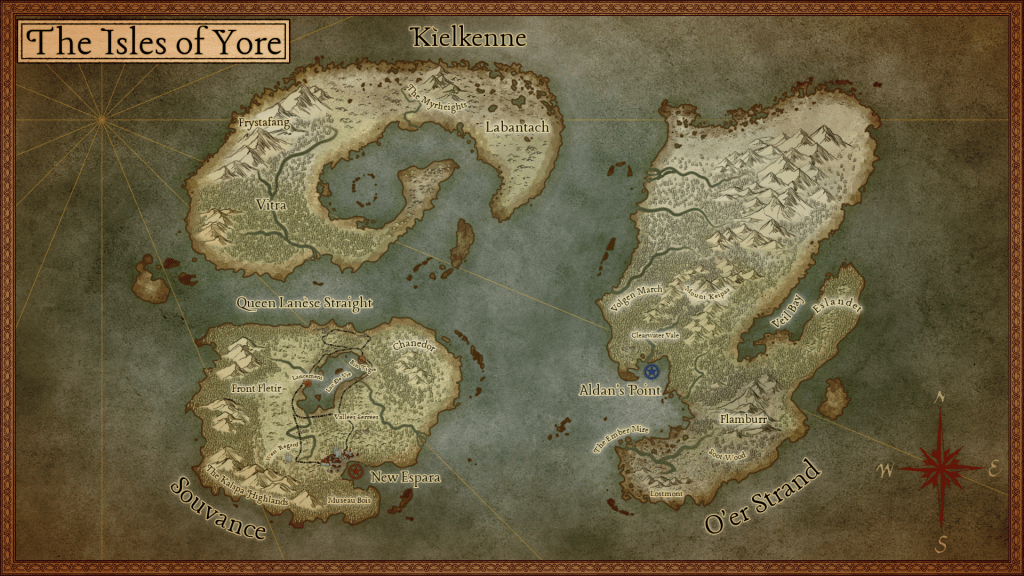 Heavily inspired by Celtic faith, Nordic traditions, and the mountains of Appalachia, The Isles of Yore is a dark fantasy project with several works both published and in progress. The map was created by the author, an artistic skill he also has significant experience with.